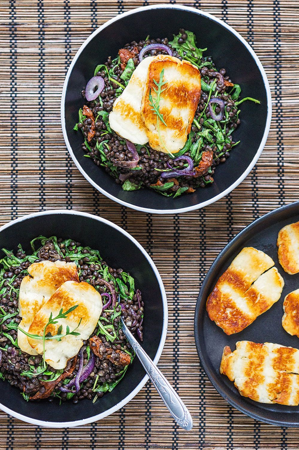 Na 4 porce potřebujete: 250 g čočky beluga, 1 bobkový list, lžičku saturejky nebo tymiánu, sůl, 1 velkou červenou cibuli, olivový olej, 125 g rukoly, 2–3 lžíce balzámového octa, pepř, 4 sušená rajčata v oleji, 250 g sýra halloumi