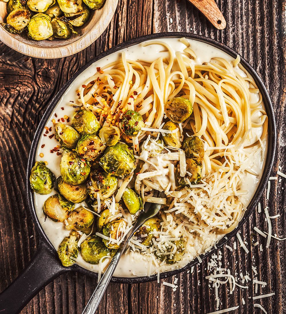 Postup: Kapustičky rozpulte, pokapejte olejem, pořádně osolte a opepřete a dejte asi na 15 minut při 200 °C péct, až začnou karamelizovat. Mezitím na rozpuštěném másle nechte rozvonět česnek, zasypejte ho moukou, ještě chvíli opékejte a pak vše za stálého míchání zalejte vínem. Přidejte mléko a smetanu a 10–15 minut povařte. Na závěr vmíchejte většinu sýra, osolte a opepřete. Zatímco se vaří omáčka, uvařte v hodně osolené vodě i těstoviny. Hotové je pak smíchejte s omáčkou a opečenou kapustou a posypejte zbylým sýrem a podle chuti i drceným chilli.