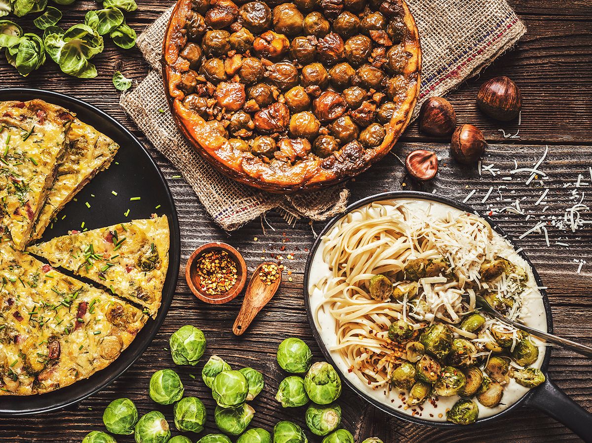 Na 4–6 porcí potřebujete: 150 g anglické slaniny, 2 šalotky, 350 g růžičkové kapusty, sůl, pepř, 8 vajec, 3 lžíce mléka, 150 g sýra (ementál, gouda, eidam), hrst pažitky