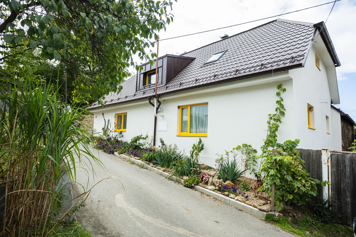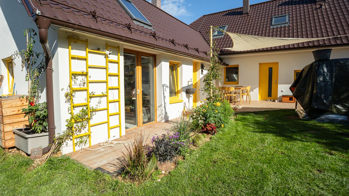 Na první pohled na domu zaujmou žluté prvky na oknech a dveřích. „Tmavé barvy, které teď převažují, nám přišly nudné. Chvíli jsme uvažovali i o zelené, ale Martin má žlutou rád, a když jsem viděla kombinaci bílé omítky a žlutých oken na Müllerově vile v Praze, bylo rozhodnuto.“