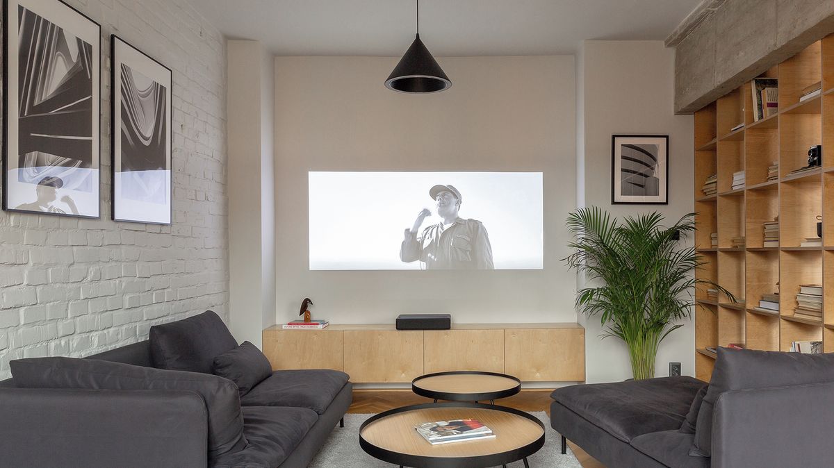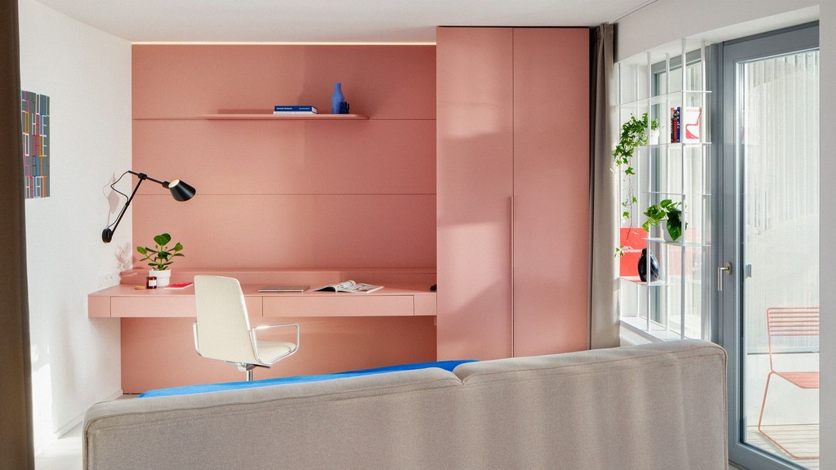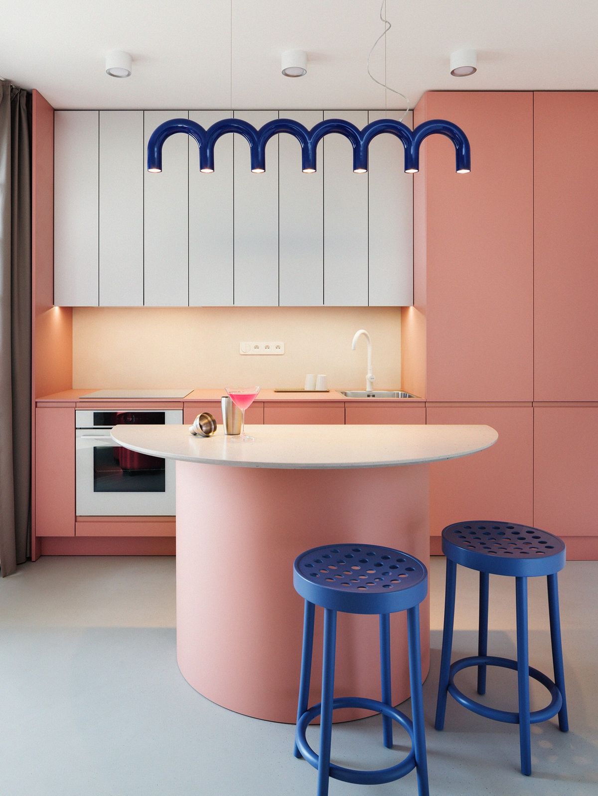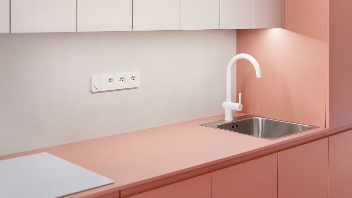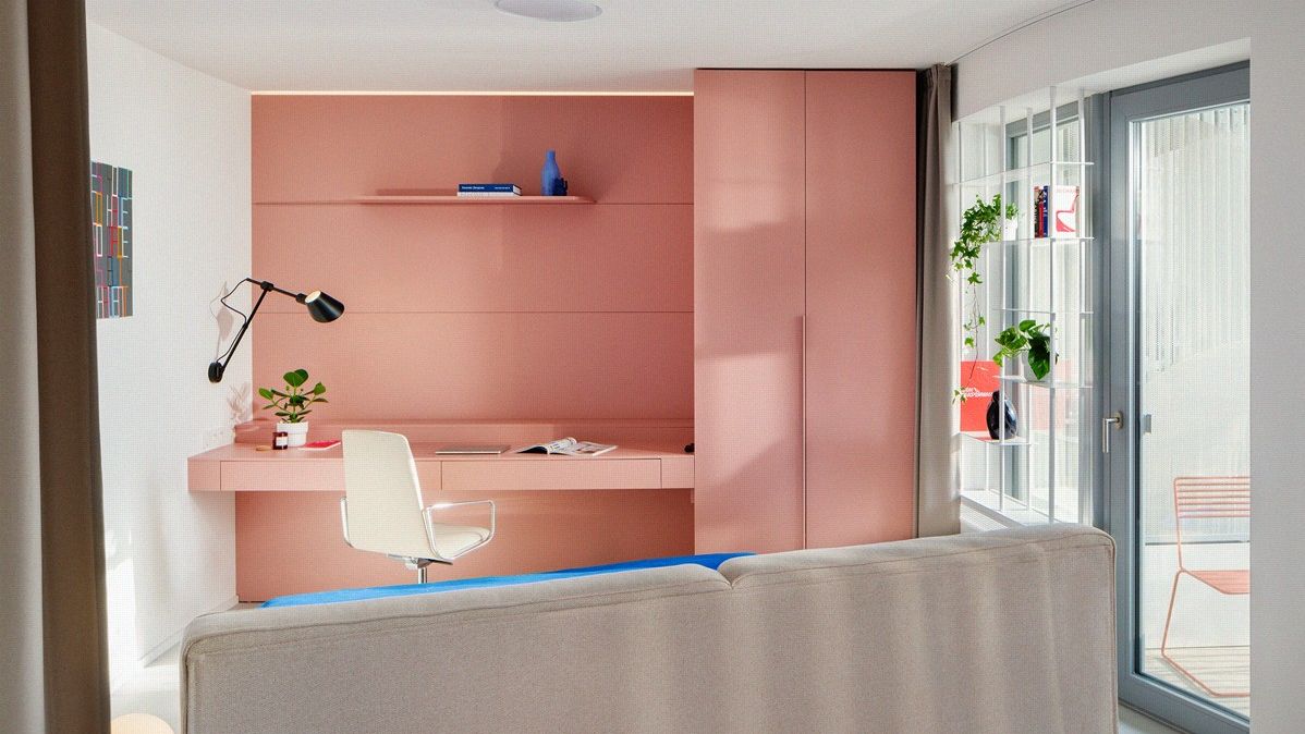 Interiér sjednocuje jednak monolitická litá podlaha a jednak, a to výrazněji, práce s velkými barevnými plochami. Jemné pudrově růžové tóny elegantně doplňuje samet, který prostoru dodává měkkost a kultivovaný výraz. Modrý akcent se objevuje v pečlivě vybraných solitérních prvcích, jako jsou židle značky TON, svítidla nebo designové porcelánové objekty. Byt tak působí krásně hravým dojmem a jeho původní nedostatky nakonec vedly k řešení, které je více než osobité.