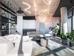 Dostat sem všechny funkční zóny včetně dostatku úložných prostor byl ovšem oříšek. Nejen kvůli výměře, ale především kvůli atypickému půdorysu. Vzhledem k rozsáhlému prosklení a oblým stěnám autoři nemohli sázet na klasické dispoziční řešení, ve kterém by velkou část nábytku umístili podél okrajů. V návrhu se proto opřeli o centrální uspořádání prostoru.