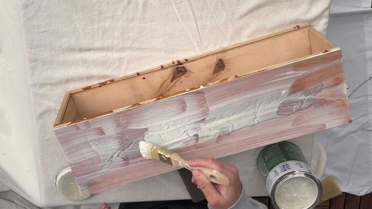 Povrch bedýnky nejprve dobře očistěte. Je-li na ní starý nátěr, pečlivě ho zbruste. (Bedýnku ve videu stačilo jen zbavit prachu a rovnou se pustit do natírání.) Nátěr naneste v několika vrstvách.