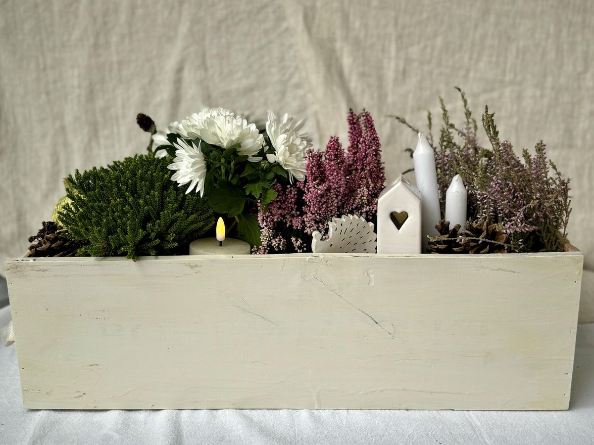 Bedýnku snadno přeměníte na zimní truhlík pomocí nové výsadby: krásně se bude vyjímat třeba čemeřice doplněná vánočními dekoracemi. Okolo bedýnky pak můžete omotat stuhu a zavázat mašli.