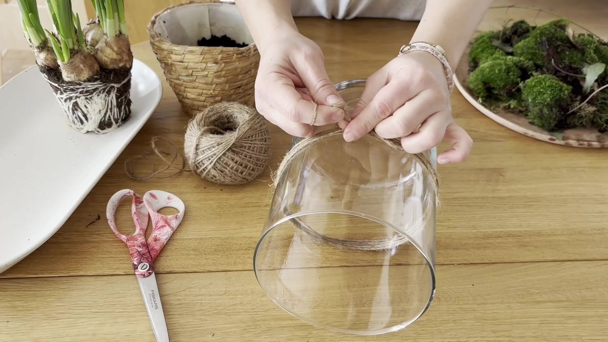 Skleněnou vyšší nádobu oživte přírodním provázkem: v několika vrstvách ho omotejte okolo, uvažte mašličku a doprostřed nalepte ozdobu – třeba malou kytičku nebo motýlka.