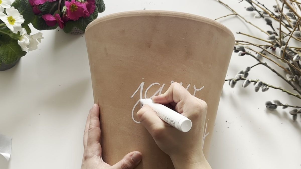 Květináč dobře očistěte. Na suchou plochu si můžete tužkou načrtnout zvolený nápis, a pokud jste si s psaním jistí, rovnou vezměte do ruky fix. Abyste dosáhli krasopísma, využijte techniku falešné kaligrafie. Je to jednoduché: nejprve nadepište daná slova a poté všechny tahy dolů zesilte.