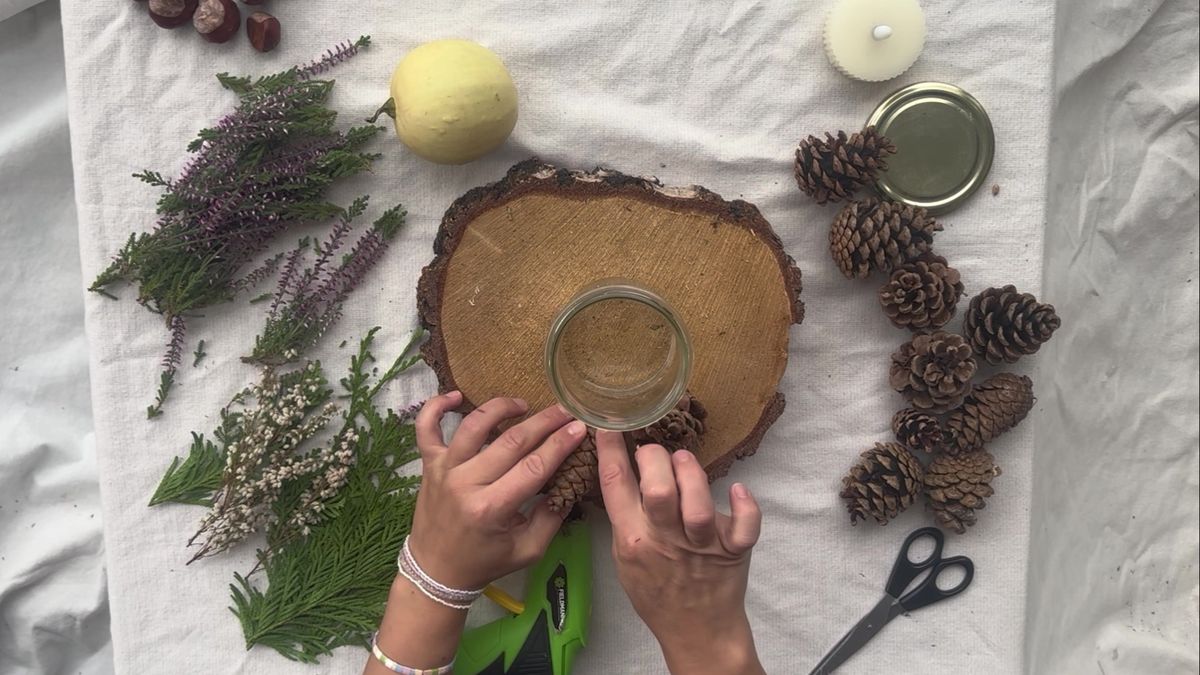 Doprostřed kulatiny umístěte vybranou sklenici a okolo ní postupně nalepte šišky. Do spodní části přírodniny naneste větší množství tavného lepidla, přitiskněte ji na dřevo a chvíli držte. Dále doplňte kaštany – hezky vyplní mezery mezi šiškami a vytvoří ucelený dojem.