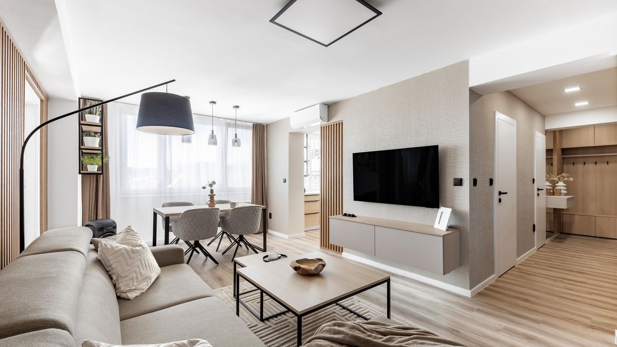 Dům, ve kterém se byt nachází, pochází z roku 1935, rekonstrukce proto vyžadovala citlivý přístup. I přes různá omezení se podařilo provést důležité úpravy. V první řadě jde o přesunutí kuchyně do jiné části domu, což přispělo k lepší funkčnosti a plynulosti interiéru, který má celkovou podlahovou plochu 85 metrů čtverečních.