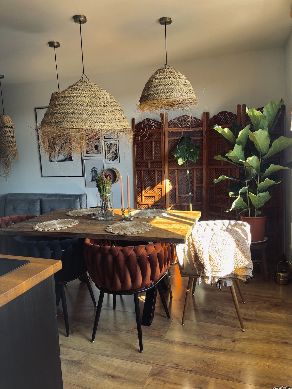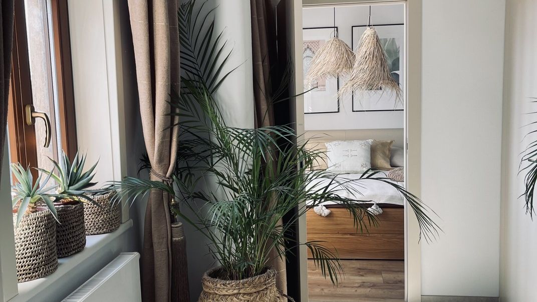 Přírodní stínidla z palmového listí dodávají interiéru lehkost a hravost, zatímco mořské trávy v podobě amfor přinášejí originální dekorativní prvek. Ručně tkané polštáře z rostliny agáve umocňují exotické ladění a spolu s kobercem z ovčí vlny jsou příjemným symbolem přírodního luxusu.