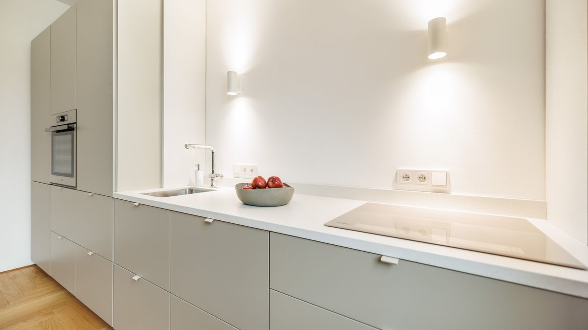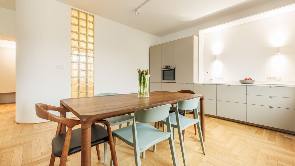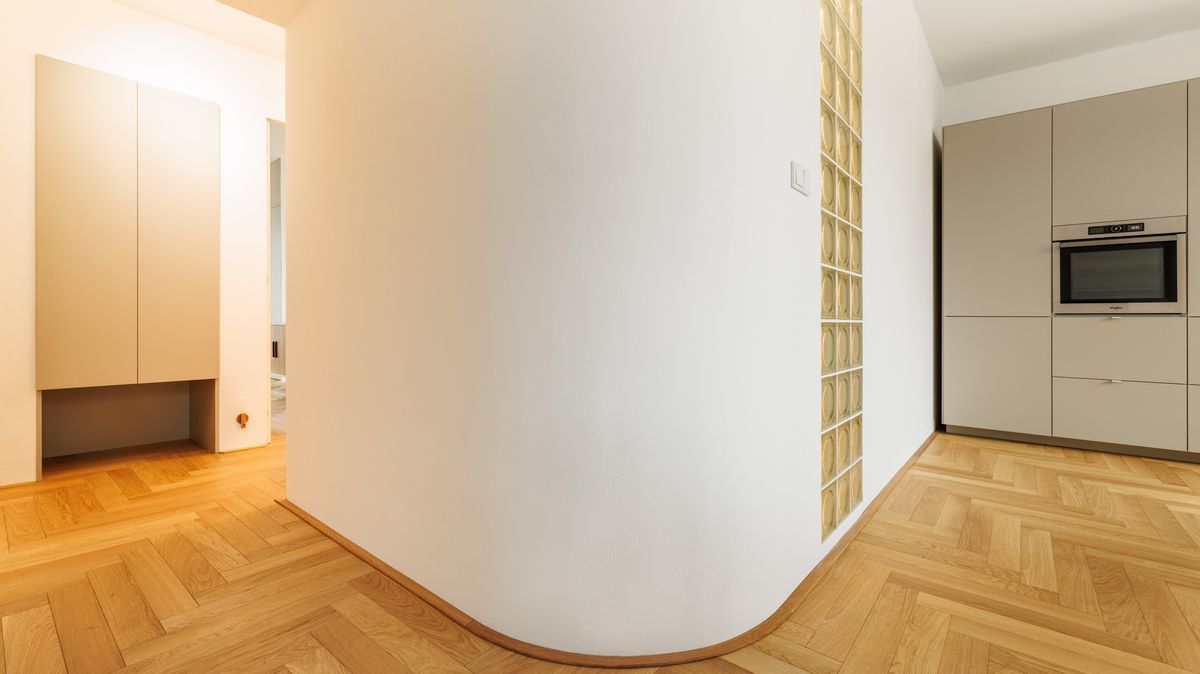 Důležité bylo také zřídit co nejvíce úložných prostor, které ale nezaberou moc místa. Řešením jsou chytře integrované skříně, komora i stropní úložné prostory. Prostor zjemňují oblouky, které umožňují plynulý pohyb bytem, a doplňují je hladké bezfalcové dveře se skrytými zárubněmi. Výsledkem je čistý, vzdušný interiér bez zbytečných rušivých prvků.
