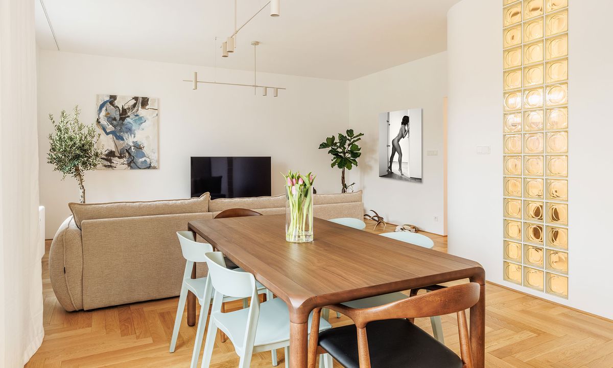Zásadní roli v návrhu hrálo světlo a orientace bytu. Autorka chtěla, aby obyvatelé přirozeně vnímali průběh dne – ráno je probouzelo slunce a večer mohli sledovat jeho západ. Tomu se přizpůsobilo i nové dispoziční řešení. Původní 2+1 se proměnilo v 3+kk, kde vznikl velkorysý společný prostor propojující kuchyň a obývací část. Zároveň se ale zachovaly dvě samostatné ložnice.