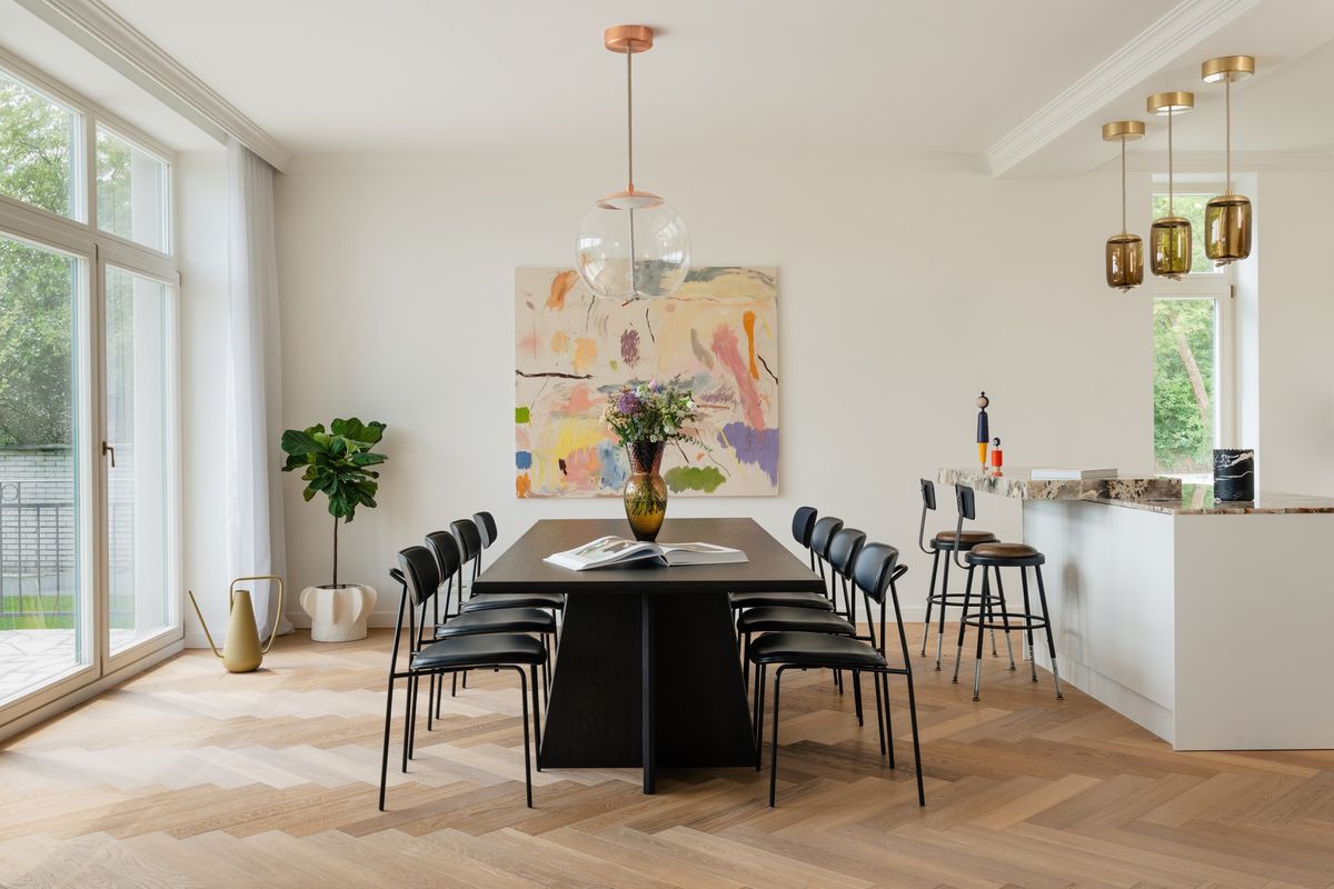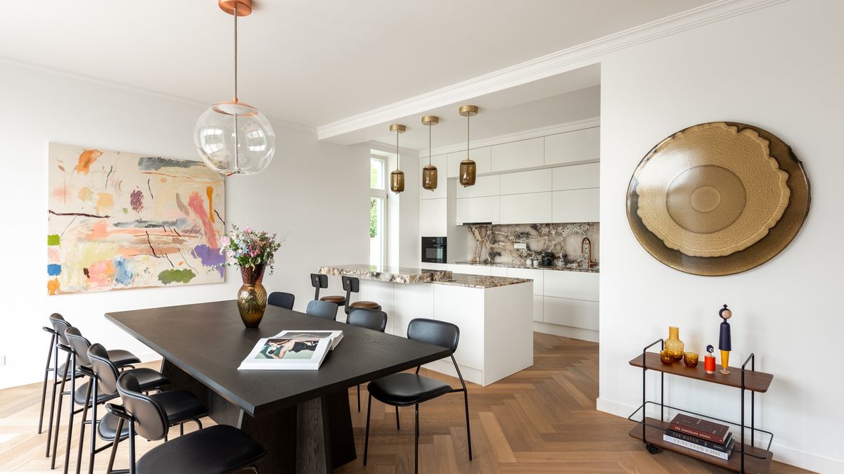 Jde o polovinu dvojvily s dispozicí 6+kk a užitnou plochou 340 m2. Právě dispozici rekonstrukce zásadně změnila. Po otevření vstupních dveří, které jsou replikou originálu z roku 1912, vás uvítá prostorné schodiště obložené portugalským merazzem. Efektní schody doplňuje repasované zábradlí. Schodiště od haly dělí dvoukřídlé prosklené dveře.