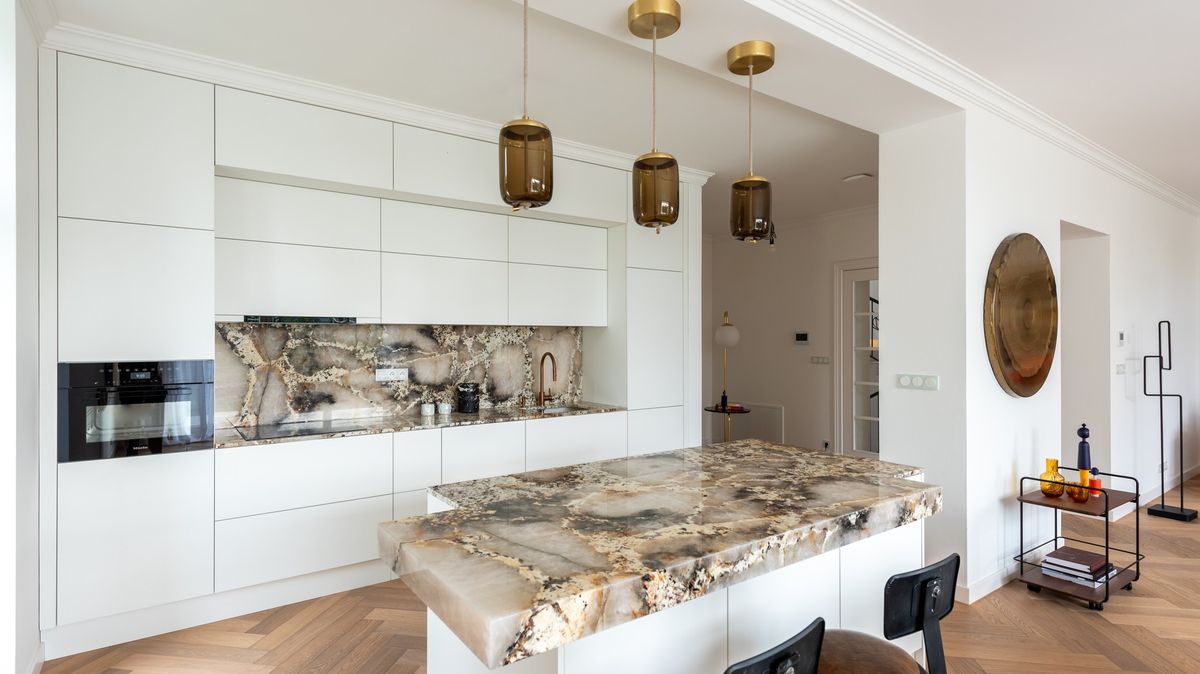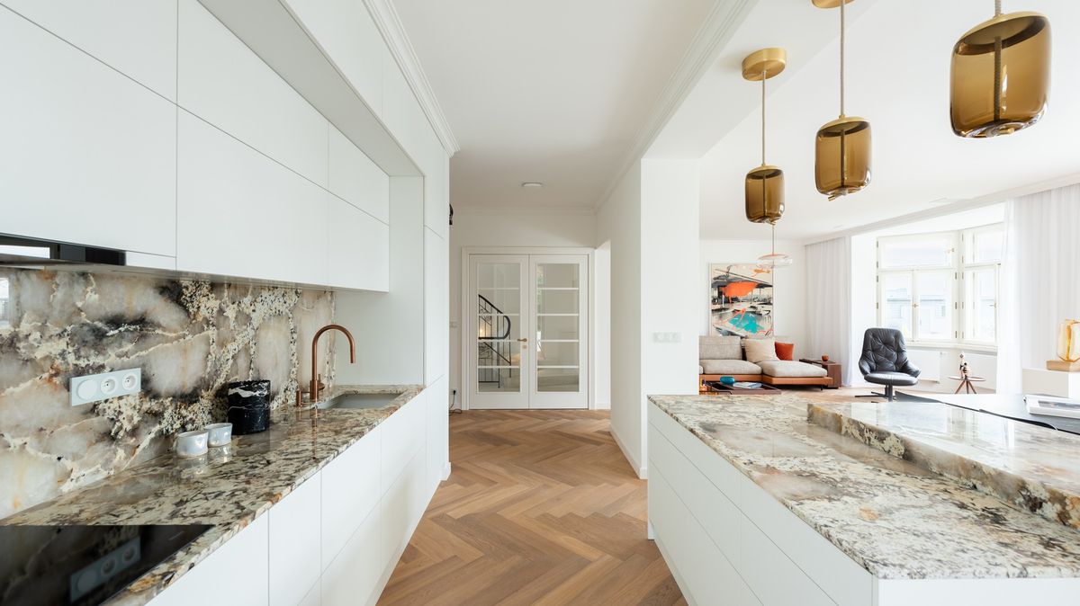 V přízemí se nachází prostorný šatník a toaleta, ovšem dominantou je kuchyně propojená s jídelnou a obývacím pokojem s přímým vstupem na terasu. Na míru vyrobená kuchyňská linka, kterou doplňuje solitérní ostrůvek a barový pult, vyniká přírodním kamenem quartzite lithium z Brazílie. V prvním patře jsou tři prostorné ložnice a velkorysá koupelna. Poslední částečně zkosené patro zahrnuje hlavní ložnici.