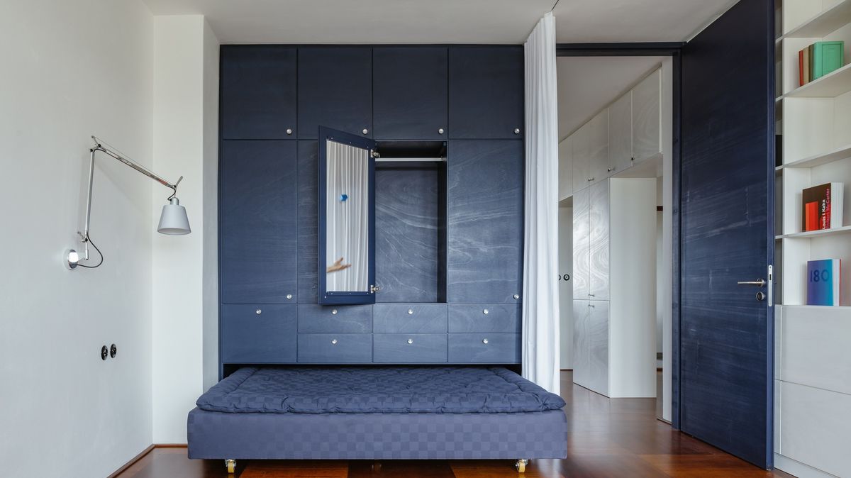 Dispozice se upravovala tak, aby odpovídala současným trendům i potřebám vícečlenné rodiny. Byt je nyní rozdělený na společenskou a soukromou část. Do soukromé vložili modrý kompaktní box s novou koupelnou, který na vnější straně ukrývá vestavěné skříně a výsuvnou postel pro hosty. Zároveň zajišťuje členění jednotlivých pokojů. Z někdejšího pokoje pro služku je nyní místnost pro domácí práce. Z haly se stala jídelna, z jídelny obývací pokoj a z obývacího pokoje flexibilní místnost pro práci i spánek.