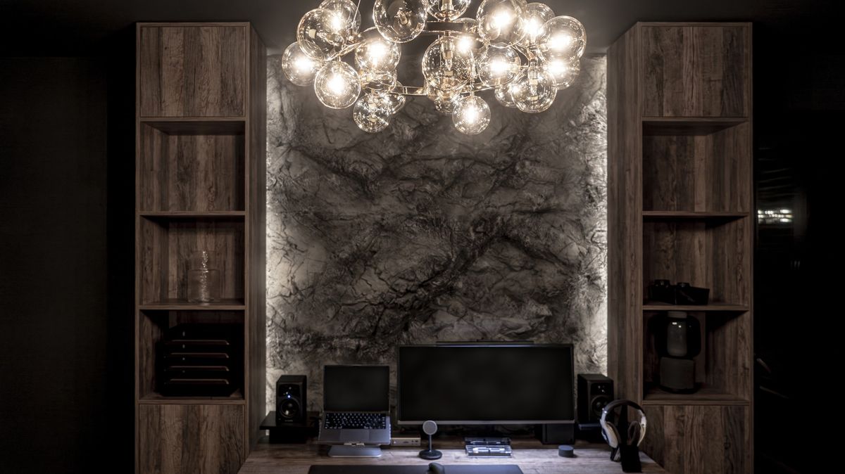 Za postelí a pracovním místem se objevují 3D panely připomínající přírodní skály. Nejde jen o vizuální efekt – tyto panely pomáhají tlumit hluk. Díky tomu je i takto malý byt dobře uzpůsobený jak na soustředěnou práci, tak pro poslech hudby i hraní na kytaru a piano.