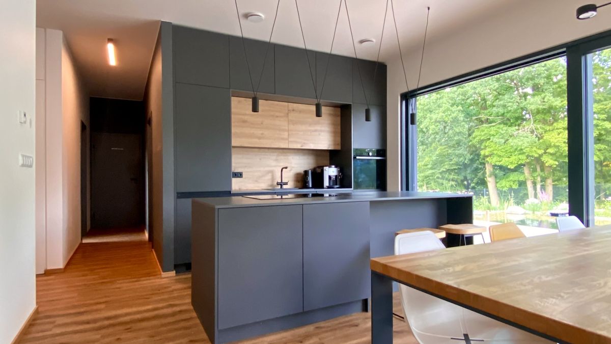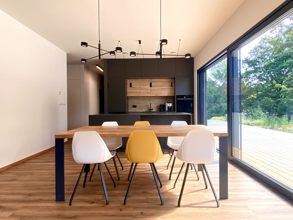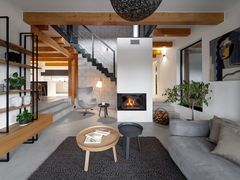 Dům má téměř 150 m2 a dispozici 4+kk, jeho srdcem se stal obývací pokoj spojený s kuchyní a jídelní částí a je kompletně otevřený směrem do lesa. „Poměrně netradičně jsme před jedno okno umístily krbová kamna, což se nám jevilo jako ideální řešení, ale nebyly jsme si jisté, co na to řekne Lucie,“ vzpomínají designérky. Majitelka potvrzuje, že zpočátku byla rozpačitá: „Po první zimě jsem ale nadšená, že můžu koukat do ohně a zároveň z okna ven.“