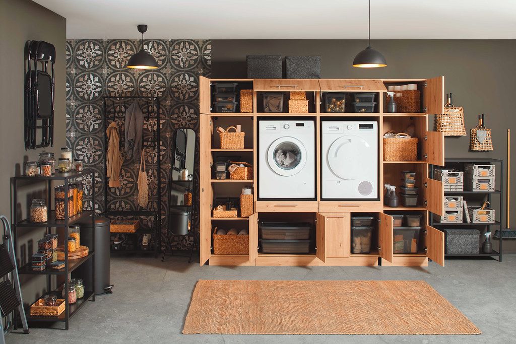 Levnější alternativou k nábytku s dvířky jsou otevřené regály a police. Samostatné místnosti obvykle spojují funkci praní a úklidu, takže zde najdete i vysoké skříně na mopy, smetáky a vysavače.