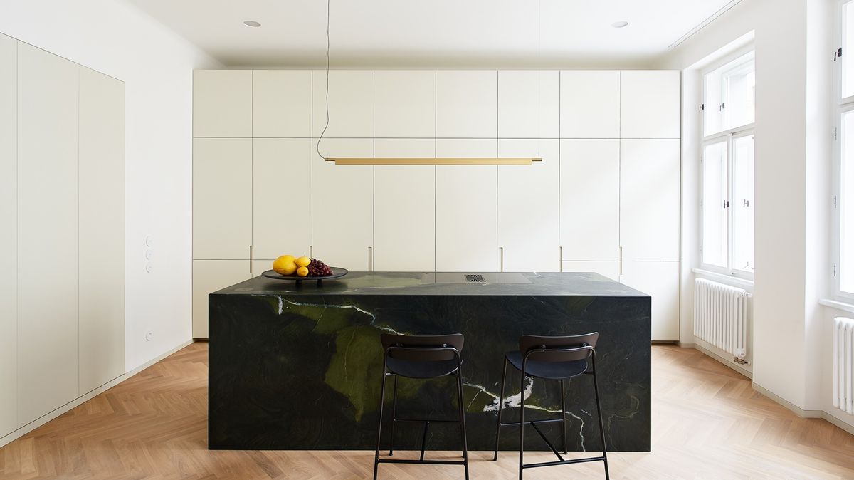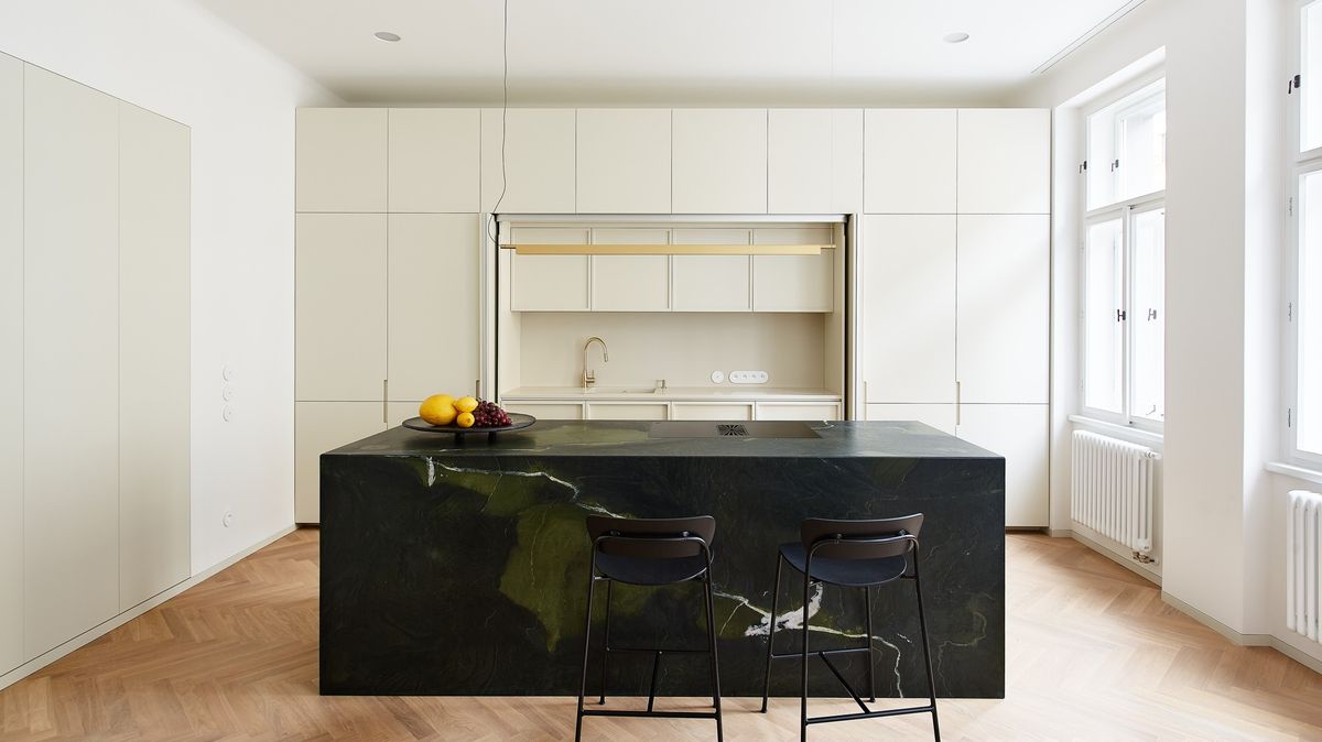 Kuchyň autoři umístili na jednom konci enfilády a představuje uzavíratelný nábytkový celek, takže může zůstat při běžném provozu částečně skrytá. Jejím nejvýraznějším prvkem je předsazený ostrůvek z barevně výrazného kvarcitu. Uprostřed obytného prostoru pak stojí kruhový jídelní stůl, který se stal středobodem celého bytu.