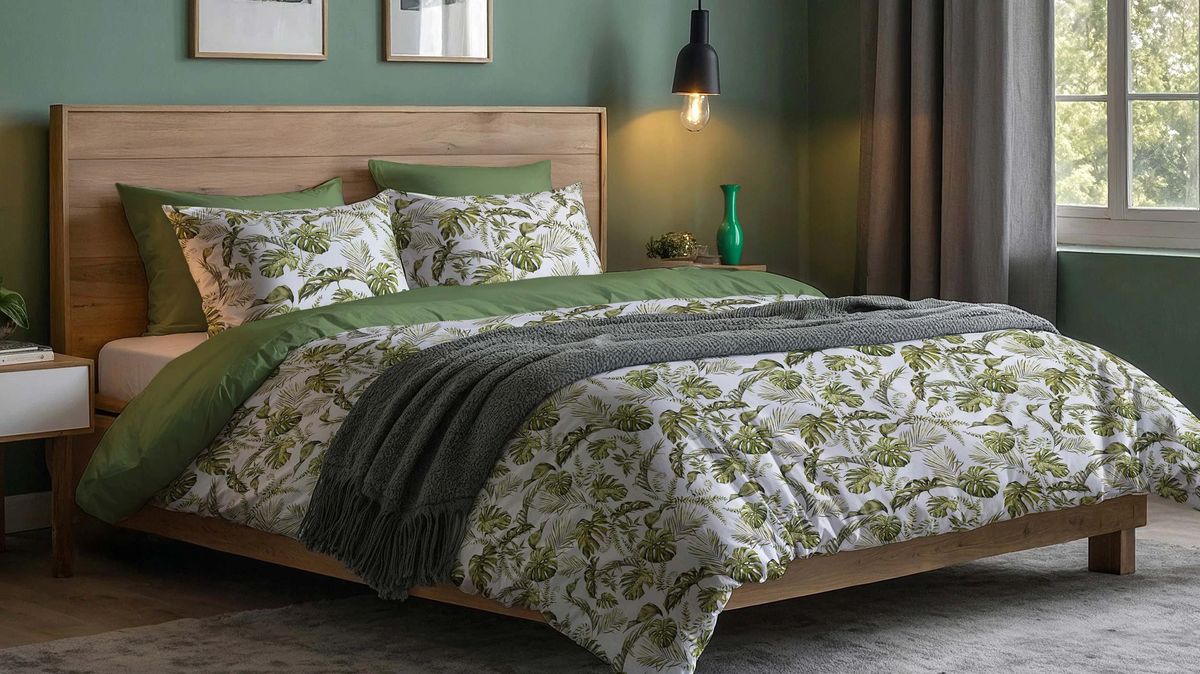 Kapradiny a zelené prvky – klid: Zelené listy (v poslední době jsou velmi moderní listy monstery) spojují s přírodou a podporují vizuální klid. Varianty se zeleným pozadím nebo jemnými motivy dokážou ložnici zklidnit a „uzemnit“.