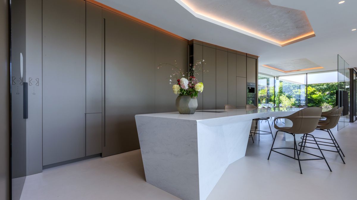 Součástí domu je i dvojí řešení kuchyně. Hlavní „snídaňová“ může díky uzavíratelné stěně splynout s interiérem. Vaření se ale odehrává v samostatné „černé kuchyni“, která zůstává skrytá. Díky tomu působí obytný prostor stále čistě a nerušeně.