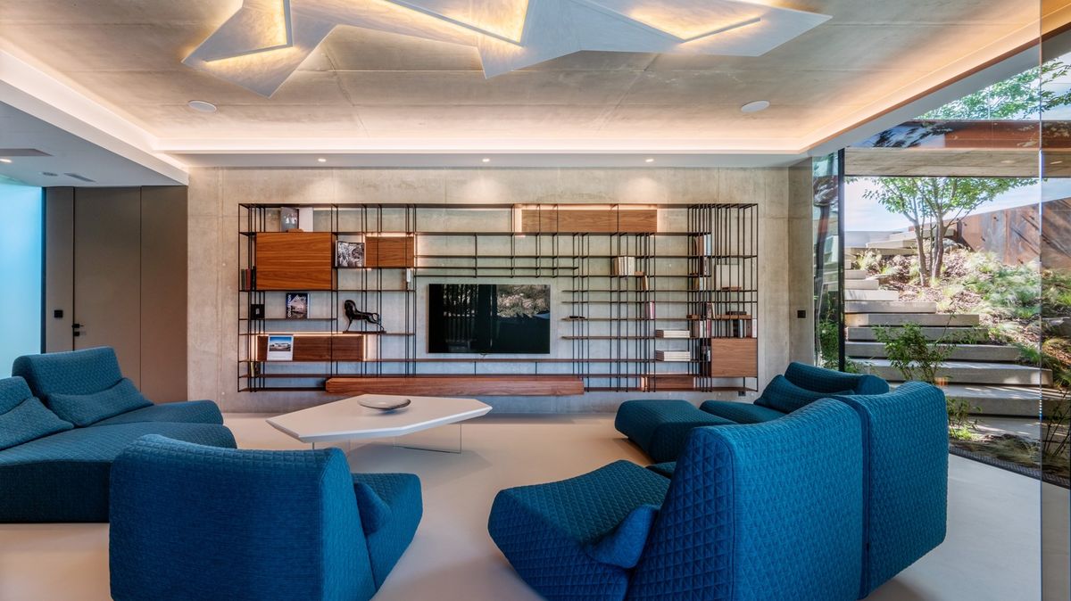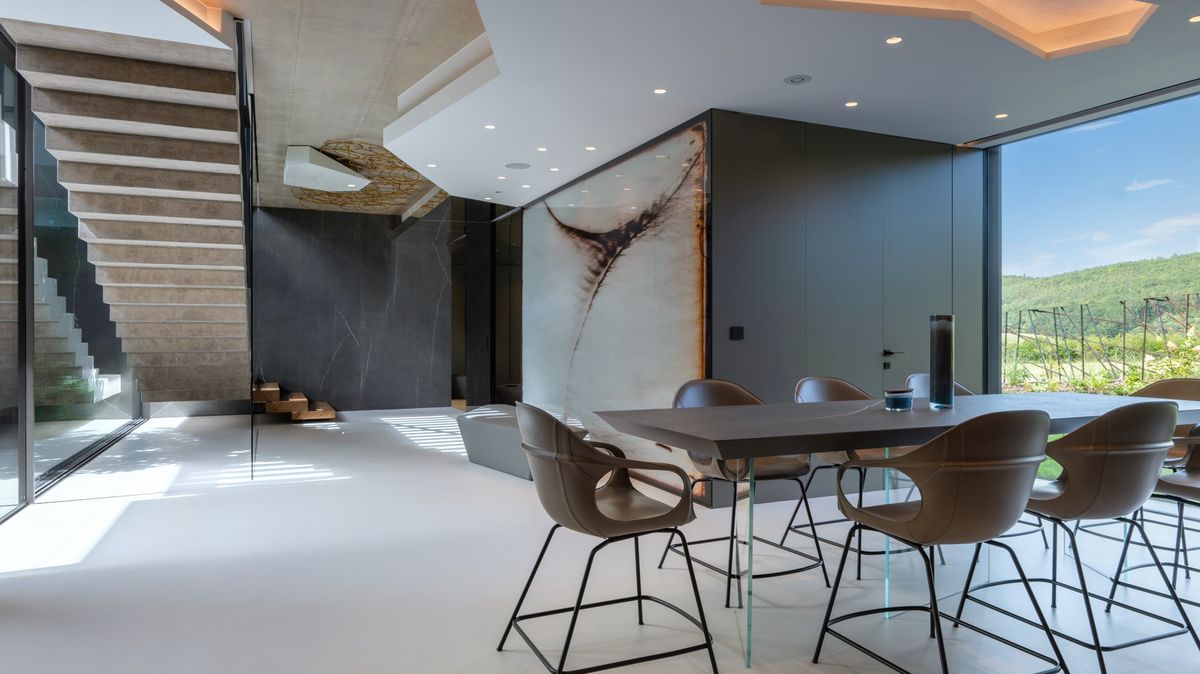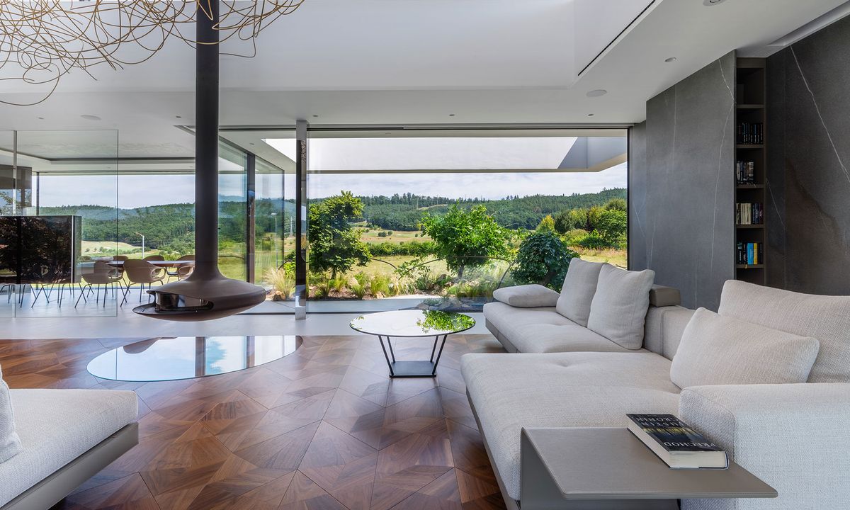 Jak je u luxusních moderních nemovitostí dnes velmi populární, velkou část fasády tvoří prosklené plochy. Díky nim se interiér přirozeně pojí se zahradou i atrii, kterým dominují vzrostlé stromy. Materiály navíc plynule přecházejí zvenku dovnitř, takže propojení vypadá velmi přirozeně a nenuceně.