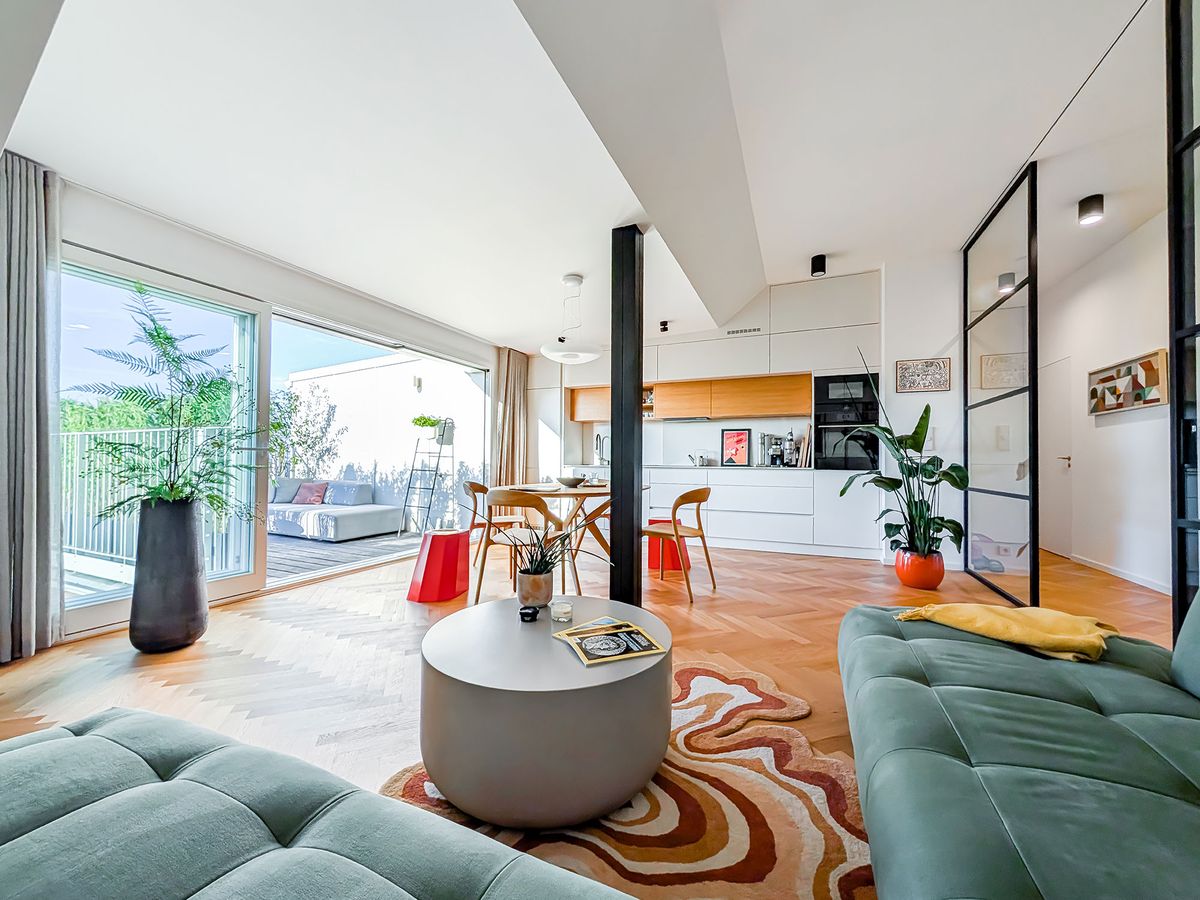 Byt tvoří kuchyň spojená s obývacím pokojem, ložnice a malá pracovna, která slouží zároveň i jako hostinský pokoj. Dále je tu koupelna, do které se vešla vana i sprchový kout, a malá technická místnost. Nejdůležitějším prvkem bytu je však terasa oddělená od obytného prostoru posuvnou prosklenou stěnou, díky které je celý byt světlý a působí velmi vzdušně.