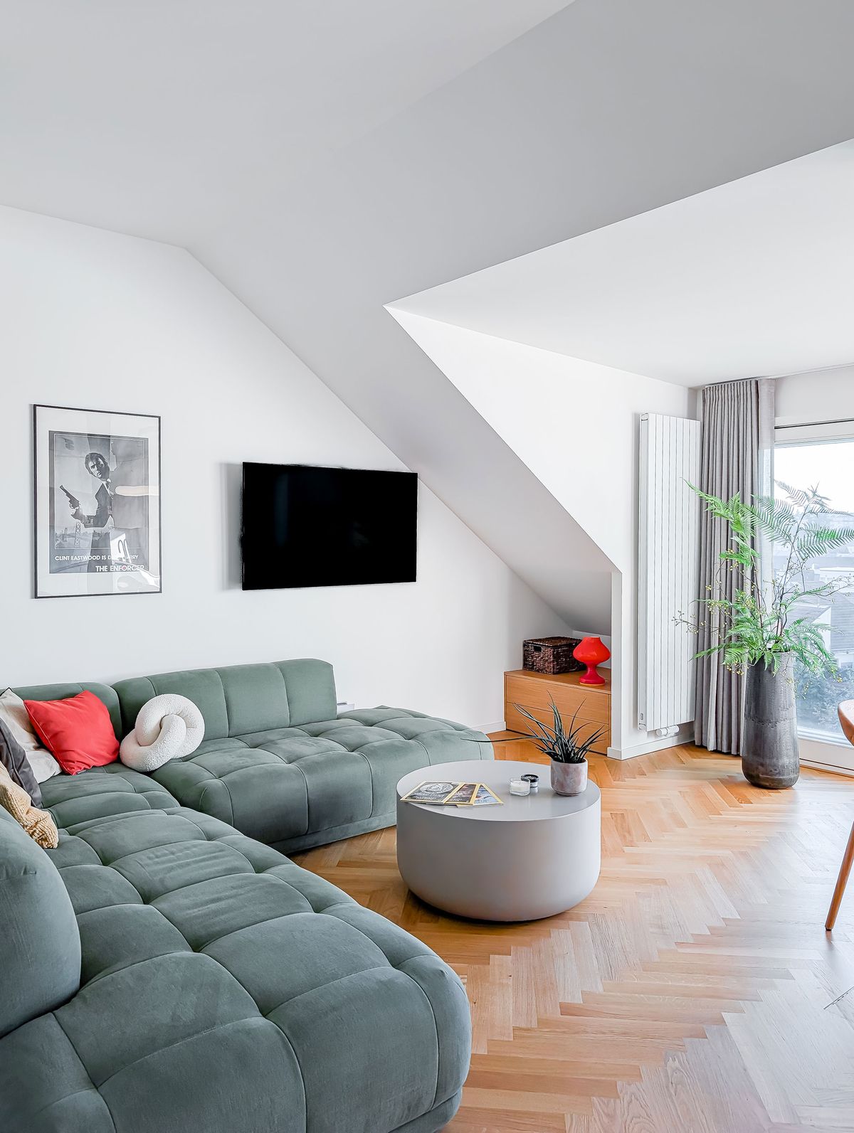 Designérka i majitelé jsou spokojení, že se povedlo sladit původní představu klientů s možnostmi, které podkrovní prostor dovoluje, a že se ho podařilo využít na maximum. „Mám velmi rád večerní pohled z gauče na nasvícený kostel svatého Norberta ve Střešovicích. V letním období je pak samozřejmě skvělá možnost zvětšení prostoru odstraněním skleněné stěny a propojení s terasou,“ pochvaluje si majitel.