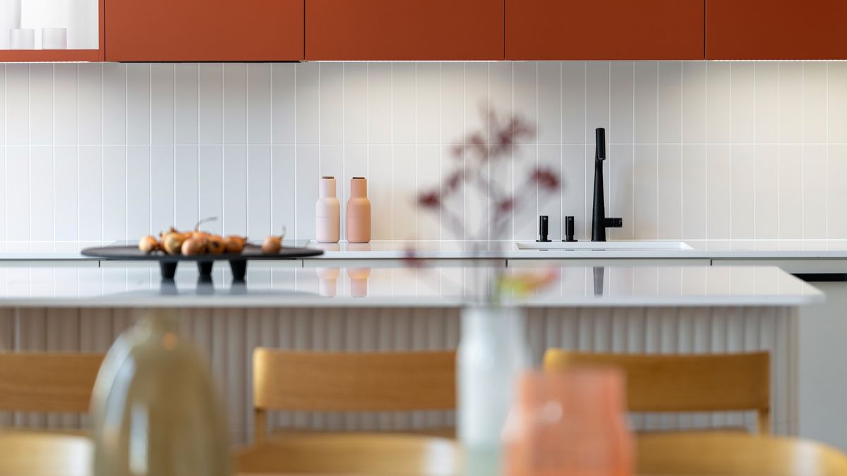 Výraznějším prvkem bytu je kuchyně v béžových tónech, kterou oživuje cihlově červený akcent. Doplňuje ji pracovní deska z umělého kamene. Zajímavým detailem je obklad, který se objevuje nejen za linkou, ale i na ostrůvku nebo krbu. V některých částech má plastickou strukturu a pracuje s oblými rohy, jinde přechází do hladší a praktičtější varianty.
