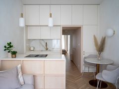 Celým bytem se prolínají oblouky a zaoblené tvary. Autoři našli inspiraci v někdejším oblém portálu v bytě, na který jejich návrh přirozeně navazuje – oblouky se objevují v průchodech, na kuchyňském ostrůvku, u krbu i v podlaze hlavního obytného prostoru.