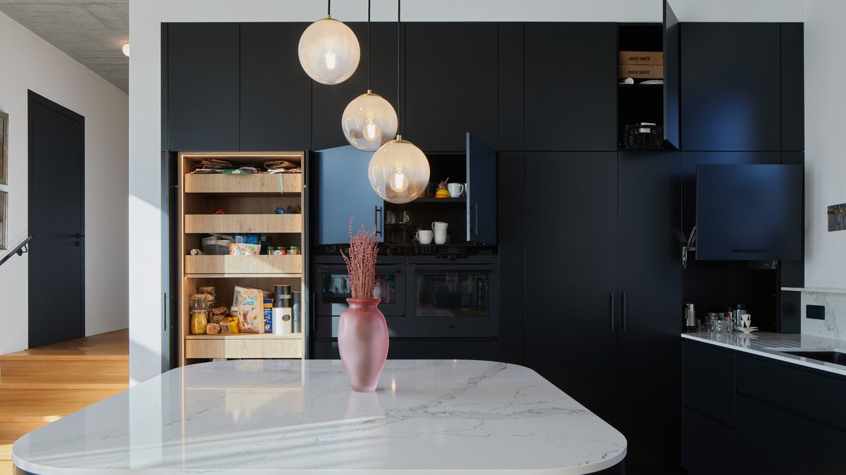 Srdcem vily je kuchyň. Kolem jejího ostrůvku se pomyslně točí celý život rodiny. Je to místo welcome drinku, když přijde návštěva, ale také kruhový objezd pro děti na odrážedlech. Zaoblené rohy k tomu úplně vybízí. Masivní dubový stůl v jídelně pojme celou rodinu a mnoho hostů. Ke komornímu posezení u ranní kávy i večerní skleničky slouží lounge hned vedle kuchyně s výhledem na zámek.