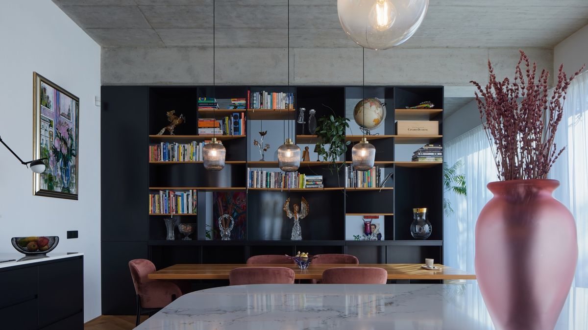 Majitelé si přáli oddělit živou část hlavního prostoru od obývacího pokoje tak, aby zde byl klid na sledování filmů. Zároveň ale měly oba celky zůstat v kontaktu. Autoři navrhli policovou stěnu, která pojímá jak knihovnu, tak sbírku uměleckých předmětů včetně skla, které je velkou vášní majitelů. Každá police je jiná: rovné jsou pro knížky, oblé a zešikmené jsou určené pro vázy, sochy nebo pokojové rostliny.