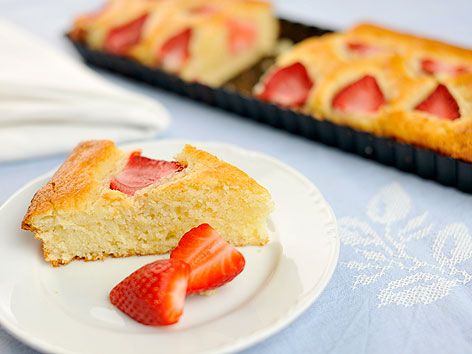 Těsto poklaďte nakrájenými kousky jahod a pečte ho asi 30 minut. Hotové můžete ještě pocukrovat.