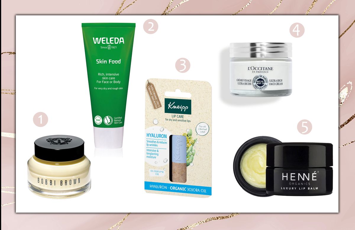 1: Pleťový krém s kyselinou hyaluronovou, vitaminem C a bambuckým máslem Bobbi Brown, 1699 Kč (50 ml), prodává Douglas 2: Univerzální krém Skin Food Weleda, 279 Kč (75 ml) 3: Balzám na rty s kyselinou hyaluronovou Kneipp, 179 Kč, prodává Hebe 4: Výživný pleťový krém s bambuckým máslem L'Occitane, 1 090 Kč (50 ml) 5: Balzám na rty Henné Organics, 24 USD (9 g), prodává MyskinoFoto: Archiv firem
