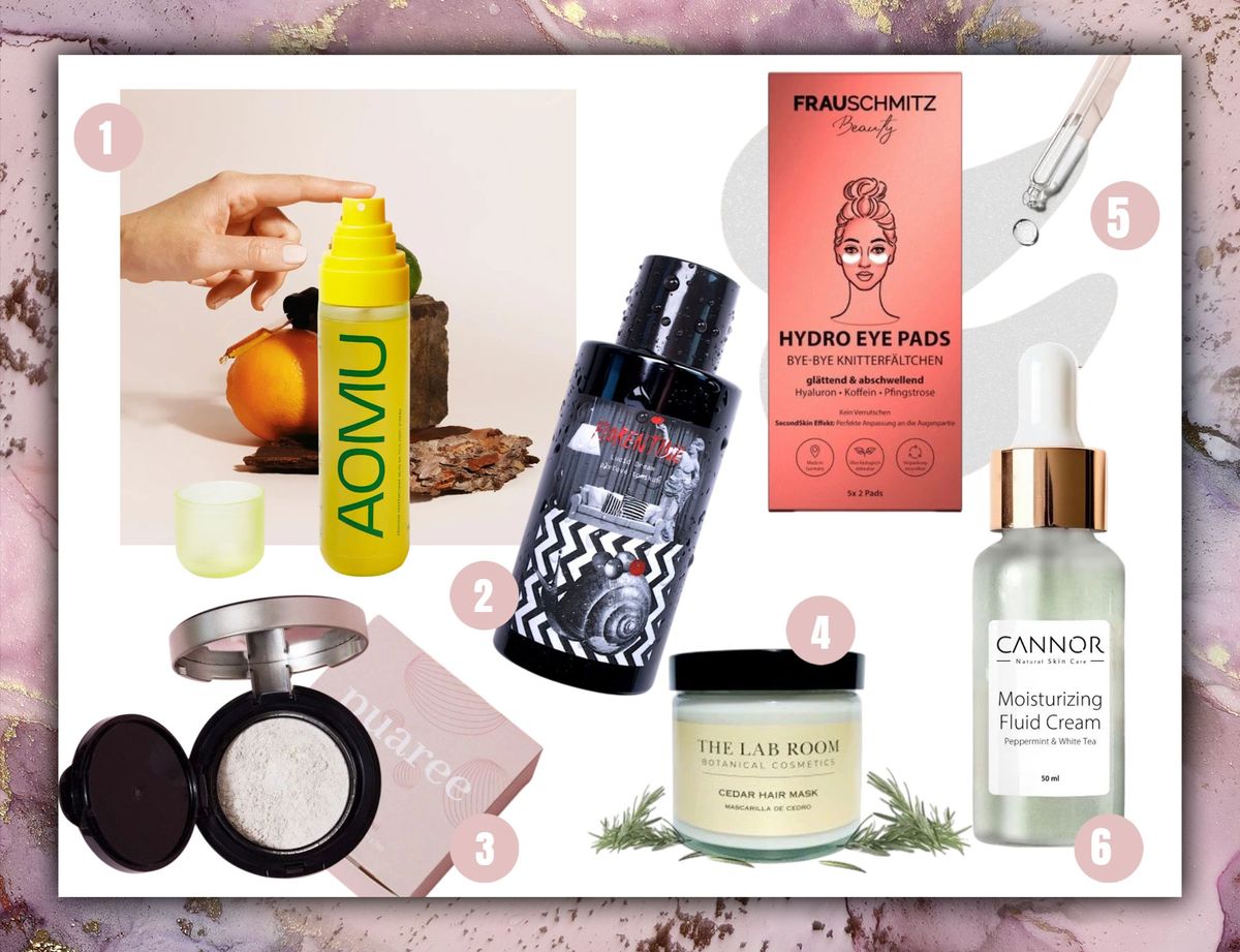 1. Happy Body Mist - přírodní parfémovaná mlha pro lepší náladu, Aomu, 599 Kč; 2. Tonikum Lucid Dream, Florentine, 1 800 Kč; 3. Transparentní minerální pudr s extraktem z řas, Puaree, 479 Kč; 4. Cedrová hydratační maska na vlasy, The Lab Room, 1 200 Kč, prodává whiteorchid.cz; 5. Oční masky na otoky a jemné vrásky FRAUSCHMITZ 5 ks, 489 Kč, prodává beautytape.cz; 6. Hydratační pleťový fluid Máta & Bílý čaj, Cannor, 395 KčFoto: archiv firem