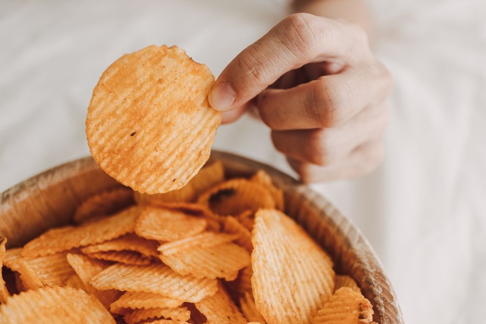 Bramborové chipsy obsahují hodně soli, která způsobuje zadržování vody v těle, otoky v obličeji, unavený vzhled pleti, její vysušení i vznik zánětlivého akné.Foto: Rachata Teyparsit, Shutterstock.com
