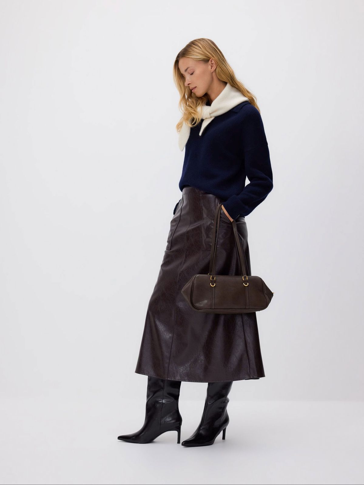 Aby tato délka co nejvíce lichotila postavě, měla by končit v té části, kdy se začíná lýtko zužovat. „To můžete korigovat podle toho, jestli si sukni vytáhnete víc do pasu, nebo spustíte na boky,“ doporučuje stylistka. Do naší módní inspirace jsme použily koženkovou midi sukni do áčka, ale v obchodech narazíte i na pouzdrové střihy s rozparkem. A nejvíc trendy odstín sezóny? Ani hnědá, ani vínová, ale něco mezi.