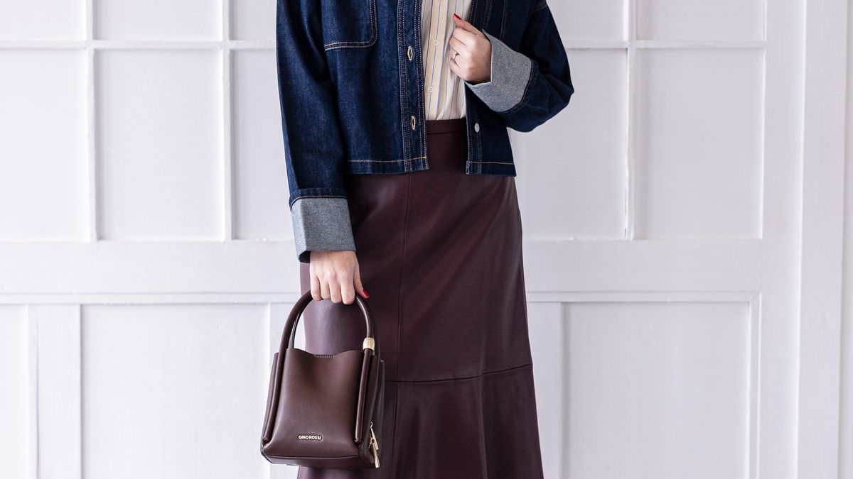 Midi sukně a košile jsou dvojka, na kterou se můžete spolehnout v mnoha situacích. Zastrkejte ji dovnitř a navrstvěte přes košili ještě jednu – klidně džínovou. Znovu si prohlédněte volbu kozaček – aby s nimi koženka ladila, stylistka zvolila semišovou úpravu. A zapomeňte na pravidlo, že kabelka musí ladit k botám…