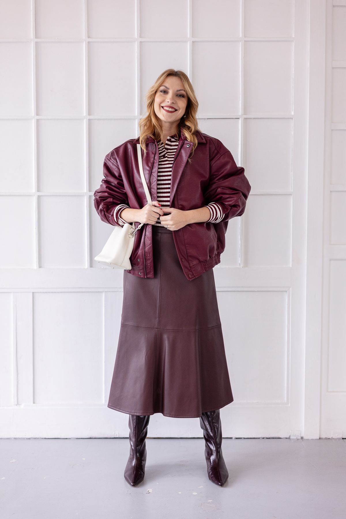 Kožený kousek neznamená, že se musíte kůži povinně vyhnout i jinde. Jak to sladit dohromady? „Kombinujte různé struktury nebo odstíny. Bomber není úplně hladký, sukně ano. Příliš harmonie je v tomto případě na škodu,“ vysvětluje stylistka. To samé si hlídejte i v případě sukně a kozaček – u prvního outfitu mají sice podobnou barvu, ale krokodýlí vzorek i lesklejší úpravu.