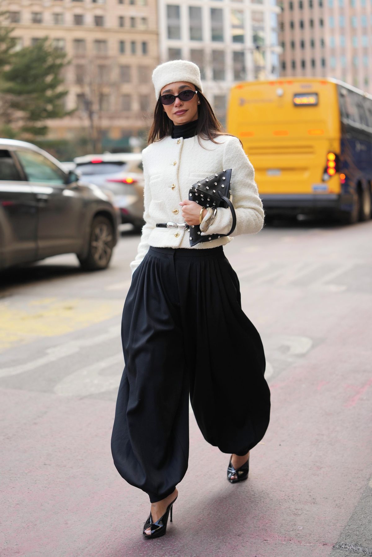 Kontrast vršku se zvýrazněným pasem a volných balonových kalhot vytváří efektní siluetu připomínající přesýpací hodinyFoto: Edward Berthelot, Gettyimages.com