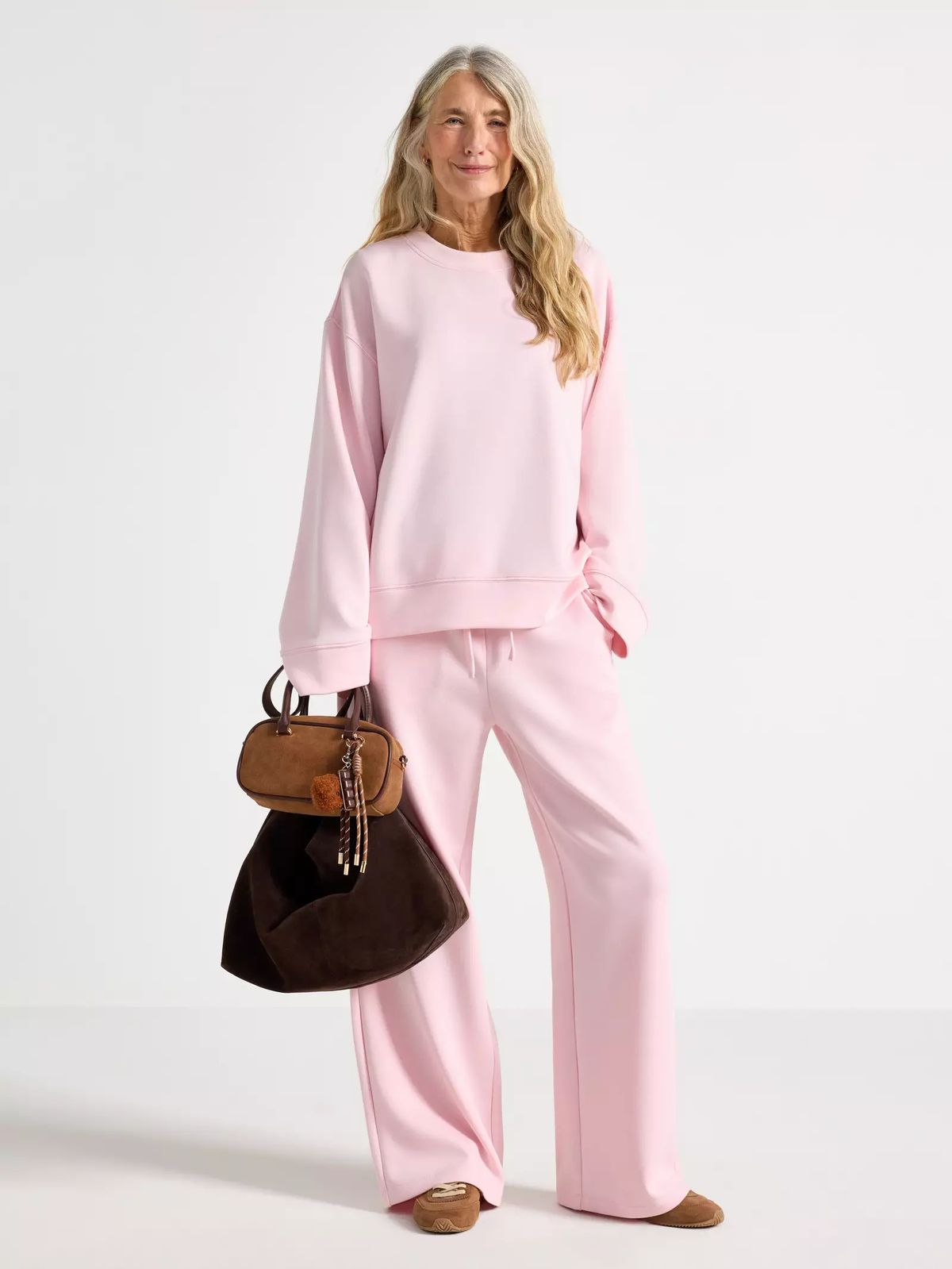 Trendem posledních let jsou pletené komplety, které najdete v mnoha variacích. Kalhoty mohou doplňovat zavinovací svetry (odkaz na trend balletcore), ale i kousky, které svým střihem imitují mikinu na zip.