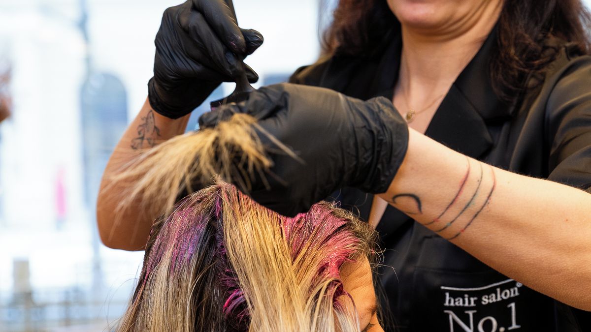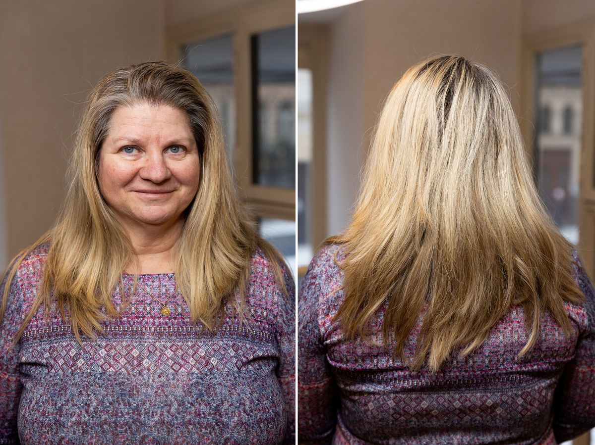 „Klientka přišla s melírovanými blond vlasy, ve kterých působila zbytečně mdle. Proto jsem se zaměřila na výběr barvy, která ji rozzáří a zvýrazní její krásné modré oči,“ vysvětlovala kadeřnice, která se rozhodla pro měděný odstín s růžovým nádechem: „Využila jsem toho, že jsou vlasy v délkách světlejší, a zatímco k hlavě jsem nanesla permanentní barvu, do délek jsem aplikovala přeliv, který vlasy krásně vyživí. Finální barva je nepatrně tmavší u hlavy, díky čemuž působí živěji a více přirozeně.“
