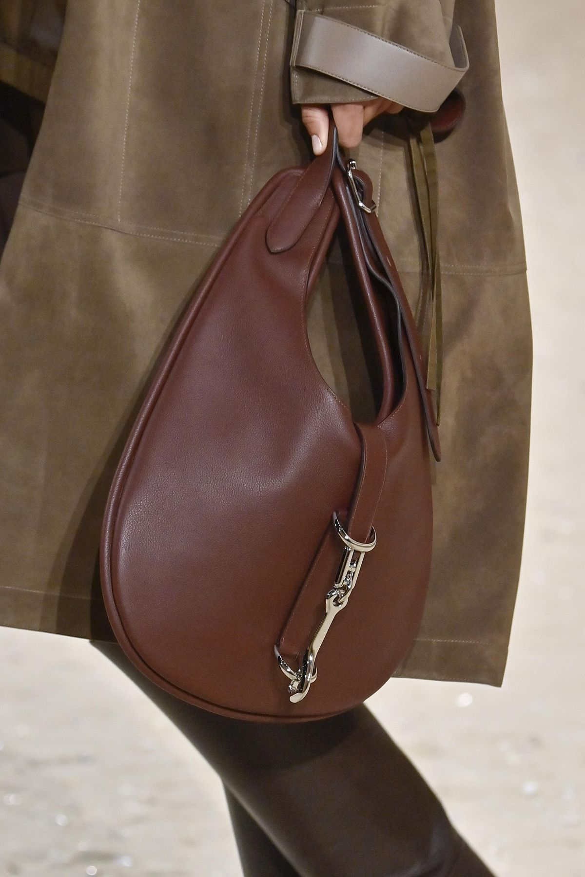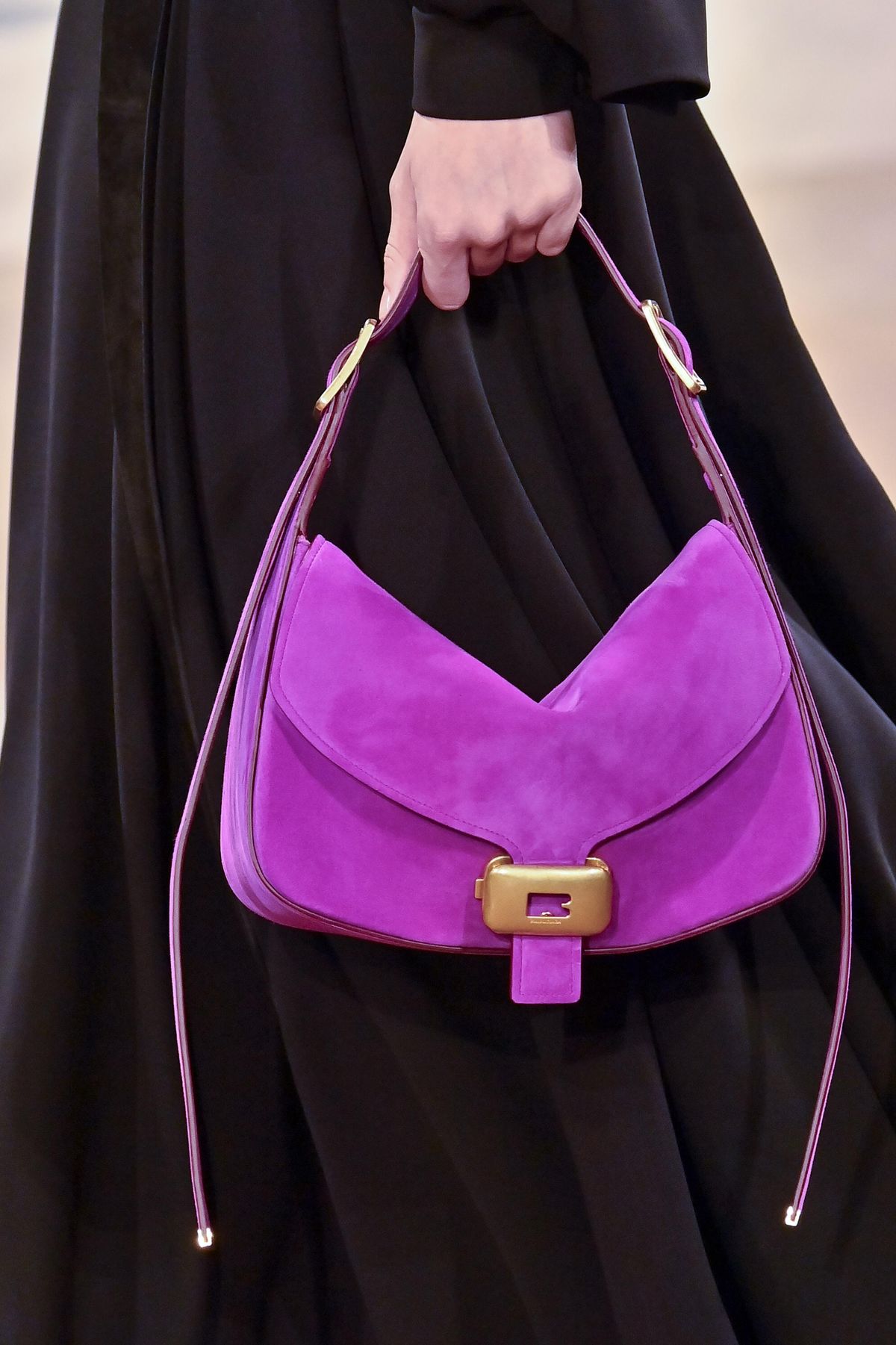 Dior zůstal u tlumených odstínů, které jsou pro semiš typické, spousta dalších brandů ho ale vybarvila do jasnějších tónů. Za zmínku (a bližší prozkoumání) stojí semišové kabelky od Balenciagy, které se pohybovaly na škále od meruňkové, cihlové až po jasně fialovou.