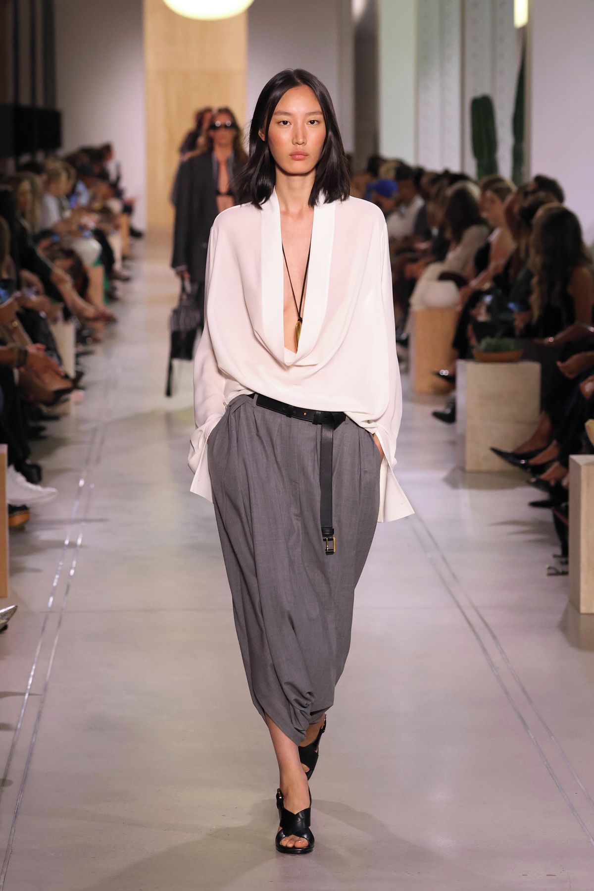 Zkrácené kalhoty, které jsou ideálním kouskem na jaro, přimíchal do své kolekce i návrhář Michael Kors. Držel se sofistikovanější formy, která nadchne všechny milovnice elegance. Bílou halenku se spadlým dekoltem doplnil šedými kalhotami a zbytek nechal na doplňcích.