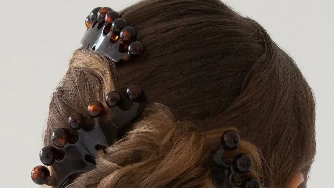 - Konečky vlasů, které z účesu vyčnívají, zastrčte dovnitř a upevněte doprostřed sponou. Pro elegantnější vzhled můžete po stranách přidat několik vlasových hřebenů.