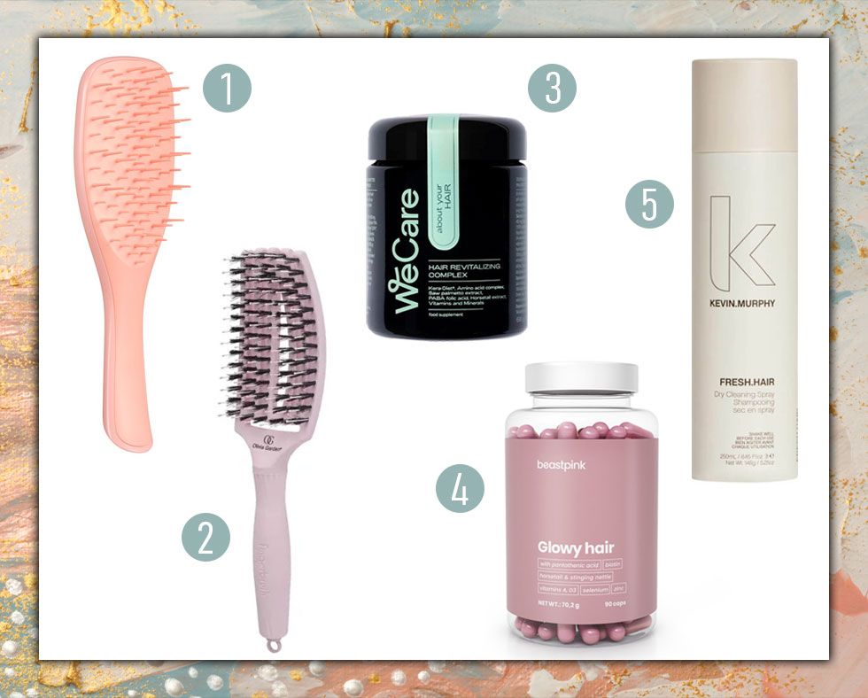 1. Kartáč pro jemné rozčesávání mokrých i suchých vlasů Ultimate Detangler Extra Gentle Saffron, Tangle Teezer, 411 Kč, prodává Pulse of Beauty 2. Kartáč na mokré i suché vlasy s kančími štětinami Olivia Garden Fingerbrush, 409 Kč, prodává Svět kadeřnictví 3. Komplex látek na podporu vlasů Glowy Hair, BeastPink, 169 kč, prodává Gymbeam (90 kapslí) 4. Doplněk stravy pro podporu růstu vlasů WeCare, 1 690 Kč (30 dávek) 5. Suchý šampon Fresh Hair, Kevin Murphy, 418 Kč (10 ml), prodává VivantisFoto: Archiv firem