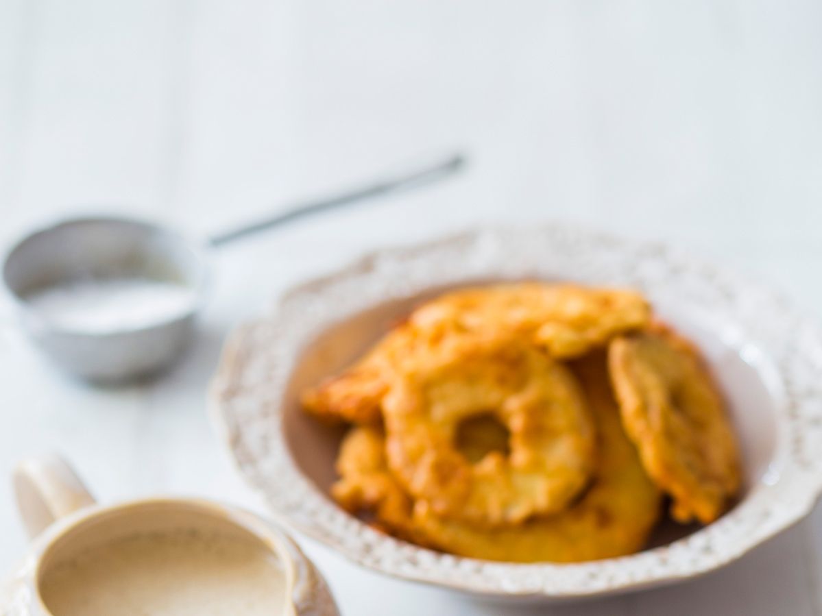 Jablka oloupejte a vyjměte z nich jádřince. Pak je nakrájejte na kolečka široká asi půl centimetru. Z vajec, cizrnové mouky, cukru, mléka a špetky soli ušlehejte hladké těstíčko, které by mělo konzistencí připomínat palačinkové těsto.