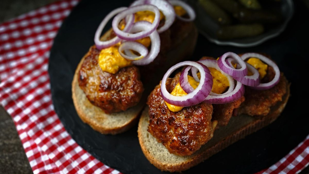 Mezitím si připravte mleté maso, které osolte, opepřete, smíchejte s 1 syrovým vejcem, nasekanou petrželí a dijonskou hořčicí. Rozdělte si ho na pět částí a vraťte se k vejcím natvrdo, která už můžete oloupat.