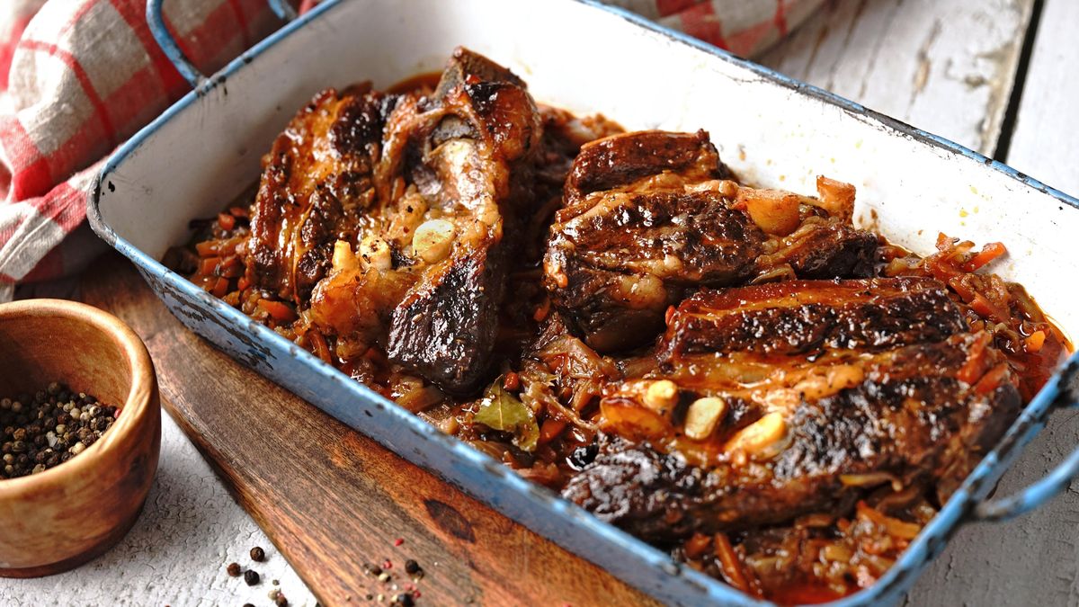 Hovězí maso nakrájejte na větší kostky, osolte a opepřete. V tlakovém hrnci na ghí maso orestujte. Když se zatáhne, přidejte na kostičky nakrájenou kořenovou zeleninu (můžete použít i mraženou). Až začne zlátnout, přidejte lžíci rajského protlaku a bobkový list, nové koření i jalovec, zamíchejte a zalijte vývarem. Tlakový hrnec přiklopte a duste 60–70 minut. Po této době by maso mělo být už měkké. Vyndejte ho na talíř, přikryjte alobalem a dodělejte omáčku.