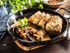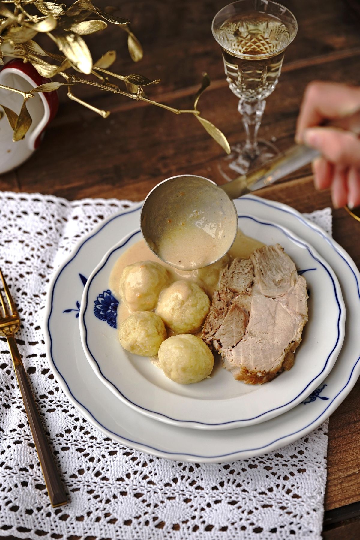 Maso nakrájejte na asi půlcentimetrové plátky, servírujte s knedlíky–noky a smetanovou omáčkou.