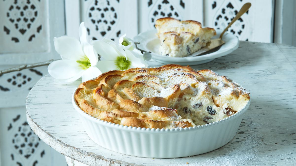 Obsah mísy nalijte do vymazané formy. Povrch můžete posypat trochou cukru, vytvoří křupavou vrstvičku, ale není to třeba. Formu vložte do rozehřáté trouby a pečte při 175 °C zhruba 45 minut, dokud nebude chléb zlatavě vypečený a nákyp neztuhne.